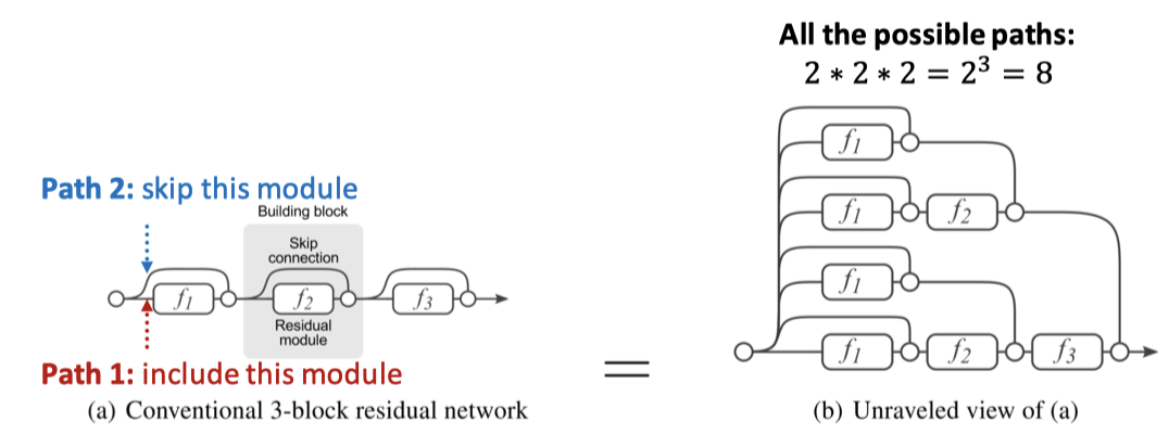 Skip-Connection은 일종의 혼합 모델을 생성한다. N개의 Skip-connection이 있다면, 모두 개의 경로가 생긴다.