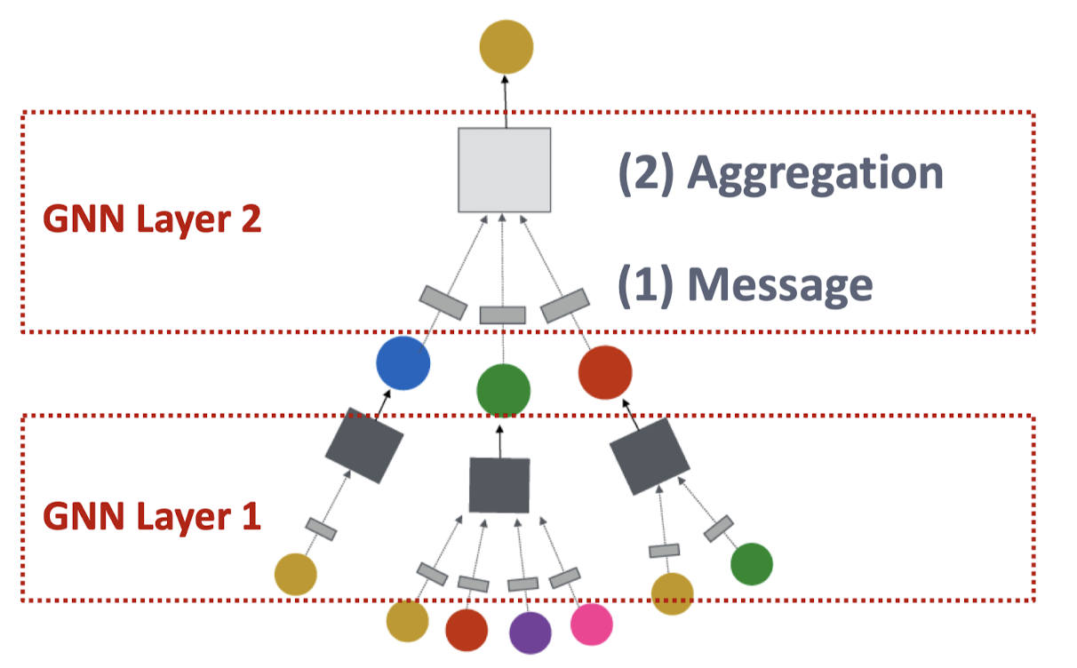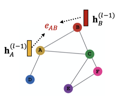 각 노드(layer)는 메시지를 생성하고, 이후 다음 노드(layer)로 전송합니다. 이전 레이어에서 온 정보인 이 현재 레이어의 메시지 변환 함수 를 통과하여 현재 레이어의 정보가 되는 것입니다.
