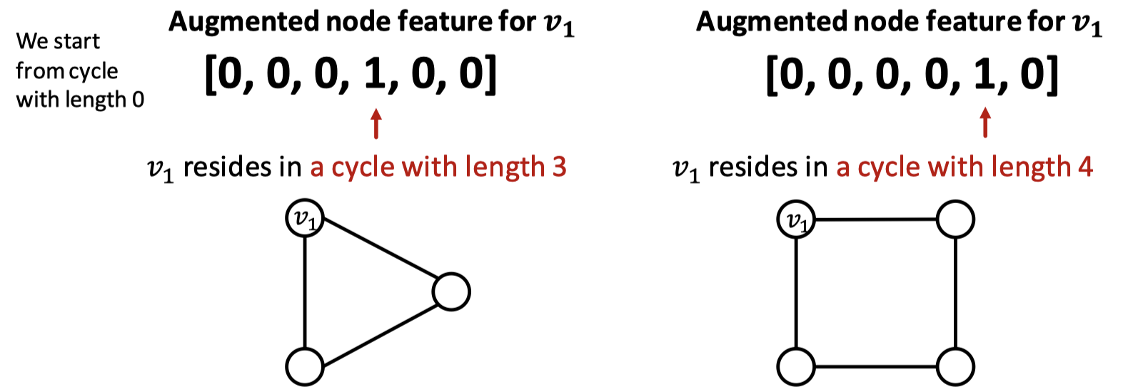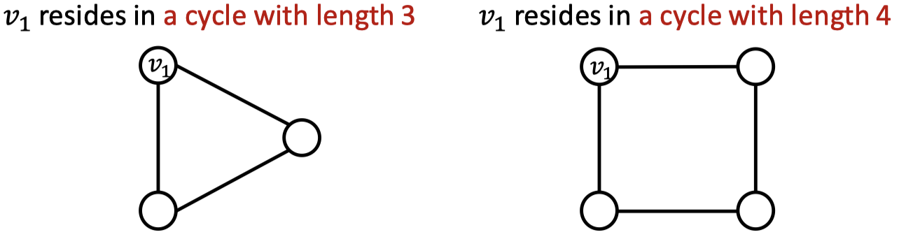 GNN은 특징 구조에 대한 학습이 매우 어렵다. 예시로, 그래프 내 순환 구조에 대한 피처를 들 수 있는데, 두 그래프에서 똑같은 을 구분하지 못한다. degree가 똑같이 2이기 때문이다. 따라서 연산 그래프는 똑같은 이진 트리를 구성하게 되는데, 이런 경우 순환 구조의 수를 노드 피처로 추가 가능하다.