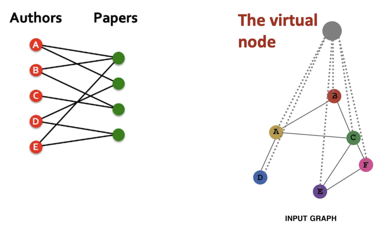 가상 노드의 경우, 모든 노드와 연결되도록 추가한다. 그렇게 하면 모든 노드는 다른 노드와의 거리가 2가 되고, 희소한 그래프에서 메시지 전달에서 크게 효과를 볼 수 있다.