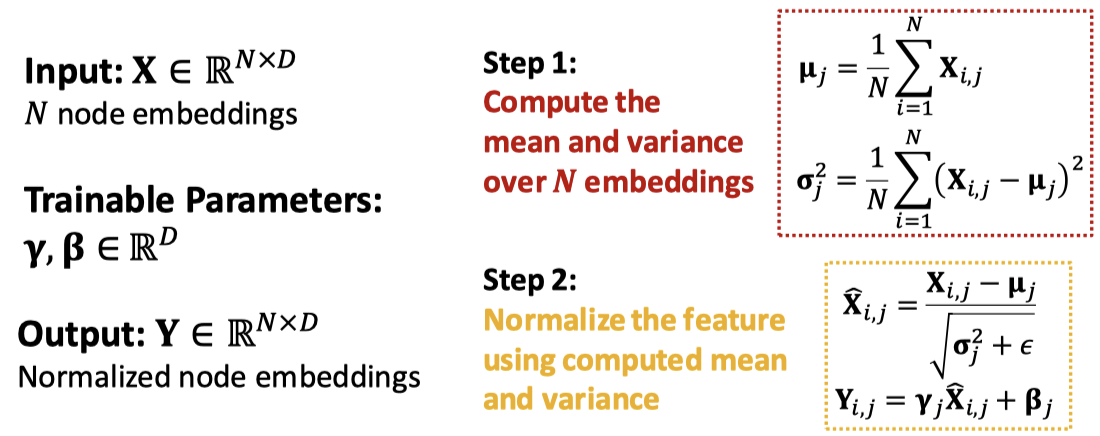 배치 정규화의 목적은 신경망을 안정시키는 것이다. 노드 임베딩의 배치가 주어졌을 때, 평균을 0, 분산을 1로 만든다.