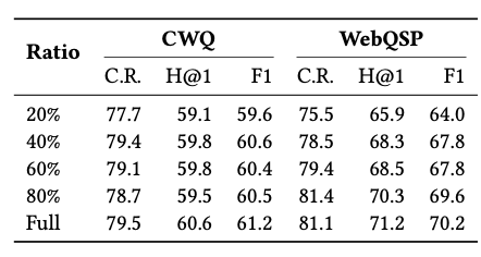 → 이를 통해, AP 검색 과정에서 이미 질문과 관련된 지식 그래프 문맥을 충분히 설정해서 랭킹 모델은 주로 구조적 정보에 초점을 맞추며 데이터 크기에 덜 의존하게 됩니다.
