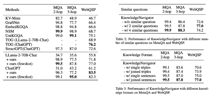 WebQSP에서는 KnowledgeNavigator가 83.5%로 다른 LLM 기반 모델보다 월등히 좋은 성능을 보였습니다.
