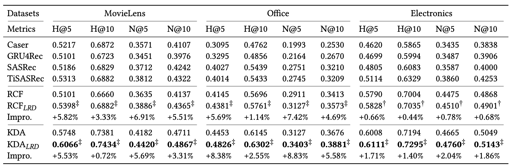 - RQ1 : LRD로 강화된 관계 인식 순차 추천 모델의 효과는 어떤가?