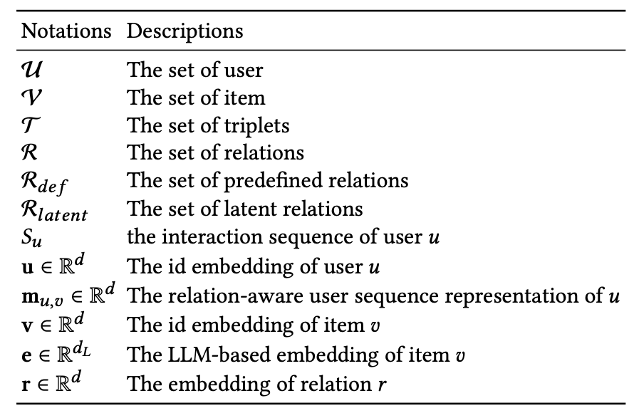 또한 관계 집합 R은 사전 정의된 관계 집합 Rdef, 잠재적 관계 집합 Rlatent로 나뉩니다. 여기서 사전 정의된 관계와 관련된 모든 triplet T는 지식 그래프 G에 저장될 수 있습니다. 여기에서 vertex 집합은 모든 관계 아이템 쌍으로, edge 집합은 모든 사전 정의된 관계로 구성됩니다.
