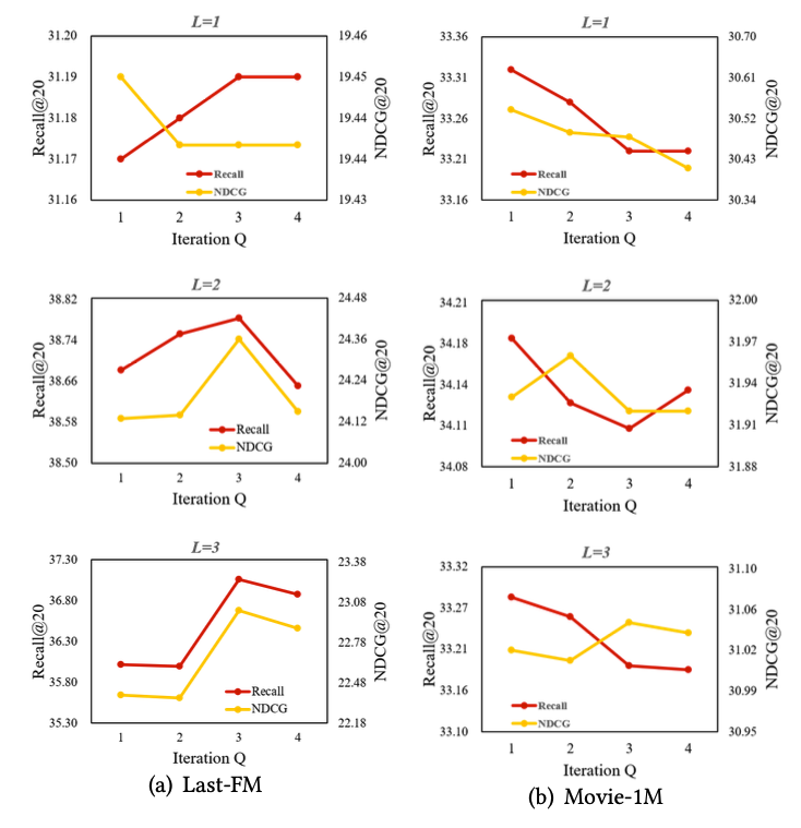 - 반복 횟수에 따른 차이(Iteration Q) : 반복 횟수가 증가할 수록 성능이 향상하지만, 필요 이상으로 커지면 노드 간 임베딩이 과도하게 가까워져 성능이 저하됩니다.