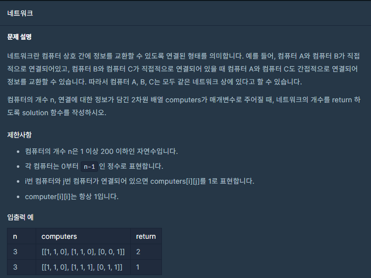 조건2. 연결에 대한 정보가 담긴 배열 computers / computers[i][j] = 1 일때, i번째 컴퓨터와 j번째 컴퓨터는 연결 돼있다는 뜻이다.
