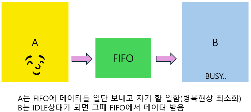 B가 Busy면 일단 FIFO에 데이터를 집어 넣고 나중에 B가 데이터를 받을 수 있는 상태인 IDLE이 되면 B는 FIFO에서 값을 빼오면 됩니다. A는 B가 busy던 말던 그냥 자기 할 일을 하면 되죠.