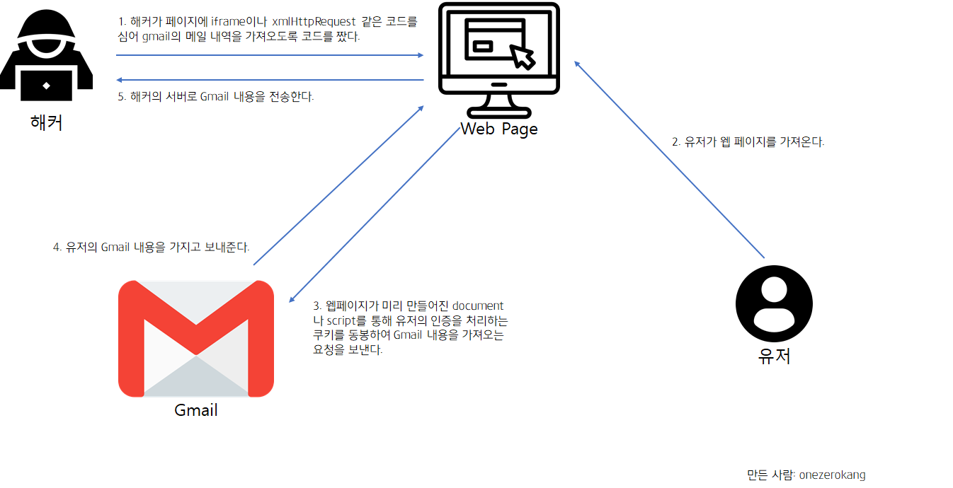 만약 해커가 페이지에 iframe이나 xmlHttpRequest 코드를 삽입하여 다른 사용자가 해당페이지에 접속했을 때 gmail에 접속하도록 한다. 만약 그 공격을 당하는 사용자가 gmail에 로그인되어 있다면 웹 브라우저는 쿠키를 요청과 함께 보내 gmail에 접근하여 정보를 가져온다.