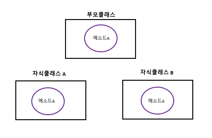 - Overriging : 부모 클래스의 메소드를 자식 클래스의 용도에 맞게 재정의하여 코드의 재사용성을 높임