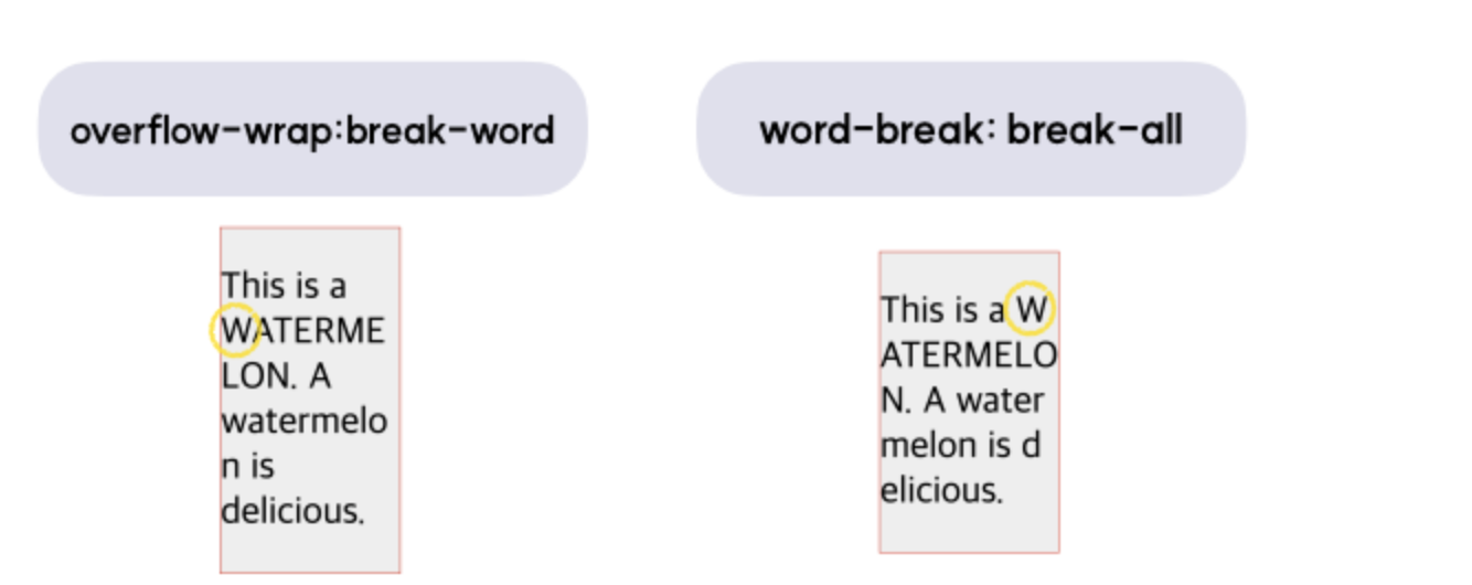 반면에 break-word를 사용하는overflow-wrap같은 경우에는 사용자가 문장을 읽기 편하도록 띄어쓰기 기준으로 줄바꿈. 단어가 길어서 content 영역 밖으로 넘칠때에만 단어 중간에 줄바꿈을 함.