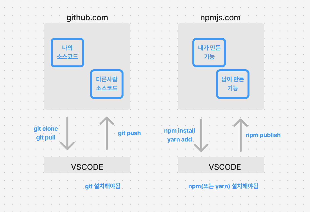 ๐ก ์ฆ, ์ฝ๋ ๊ณต์ ๋ฅผ ์ํด GitHub๋ฅผ ์ฌ์ฉํ๊ณ , ์ฌ์ฌ์ฉ ๊ฐ๋ฅํ ๊ธฐ๋ฅ(ํจํค์ง)์ ๊ณต์ ํ ๋ npm์ ์ฌ์ฉํจ.