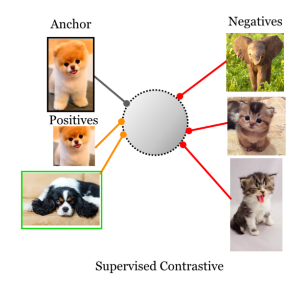 이때 배치 내의 각 샘플은 하나의 기준점(Anchor)으로 사용됩니다. 기준점을 중심으로, 동일한 클래스에 속하는 다른 샘플들은 positive pair로 간주되어 서로 끌어당겨지도록(pull),