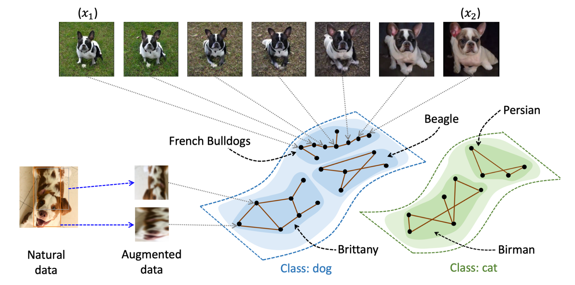 대조 학습은 지도 학습에서 같은 클래스에 속하는 예제들은 서로 비슷한 특성을 가져야 하고, 다른 클래스의 예제들은 구분되어야 한다는 가정을 바탕으로 학습됩니다.
