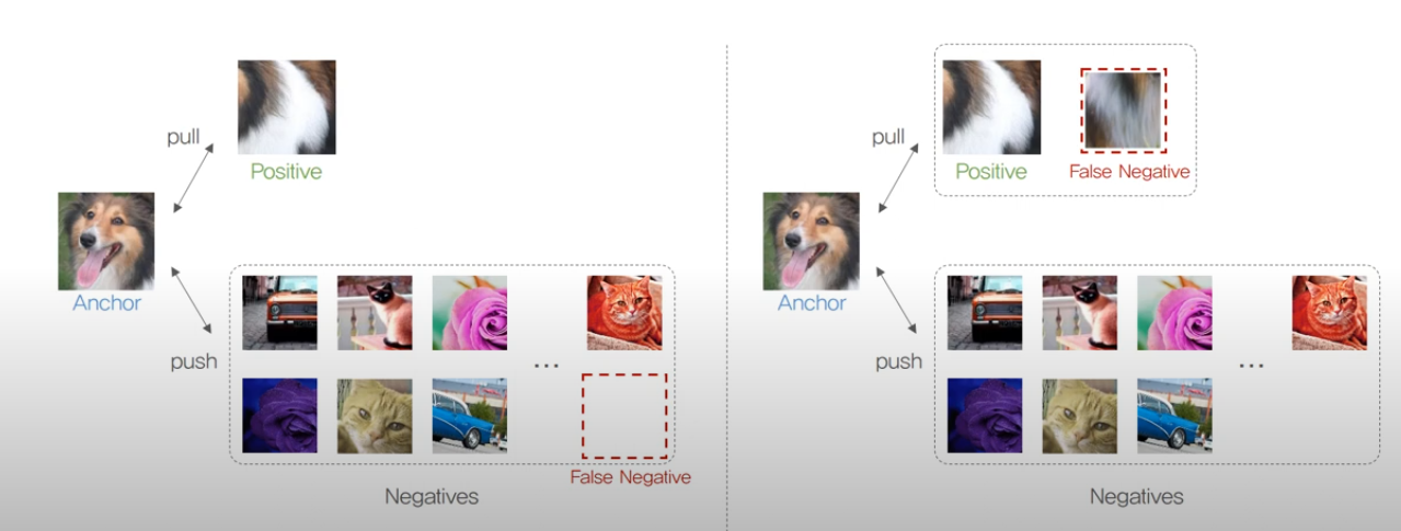 다만, 라벨이 없어 서로 다른 원본 데이터 간에 의미적으로 유사한 경우에도 negative로 잘못 처리되는 false negative 문제가 발생할 수 있습니다.
