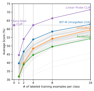 Zero-shot CLIP(보라색 선)은 별도의 미세 조정 없이도, 4-shot Linear Probe와 유사한 성능을 기록했습니다.