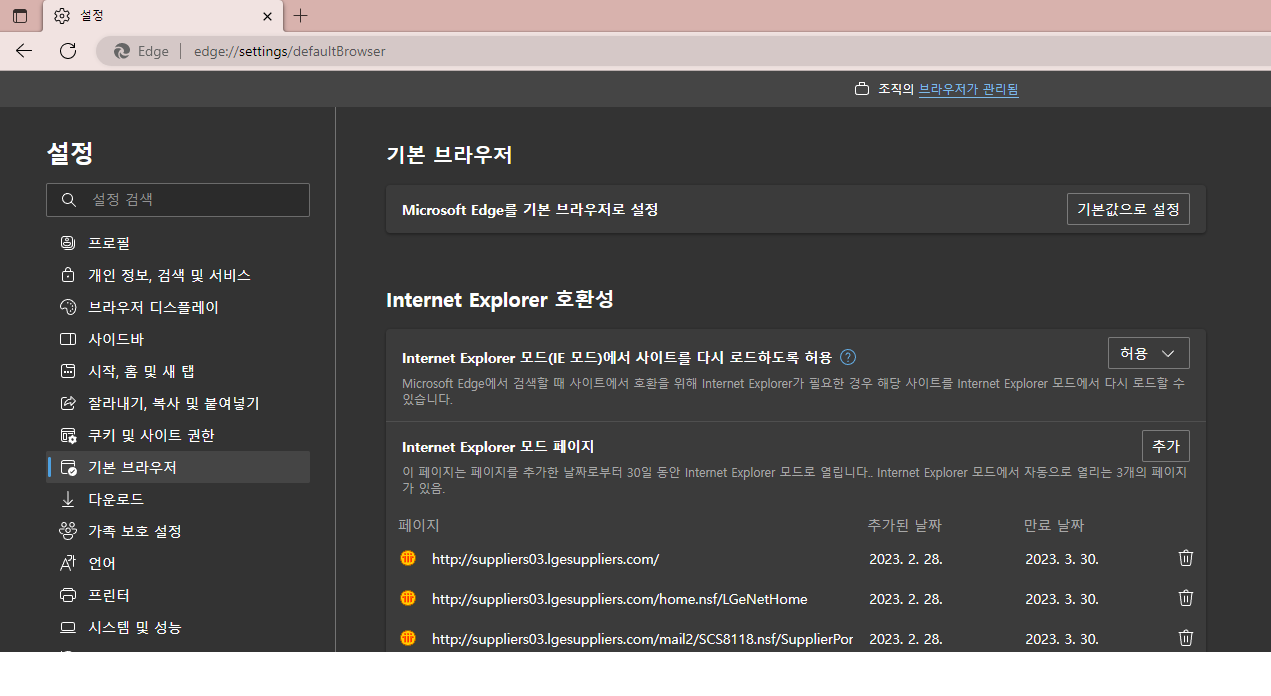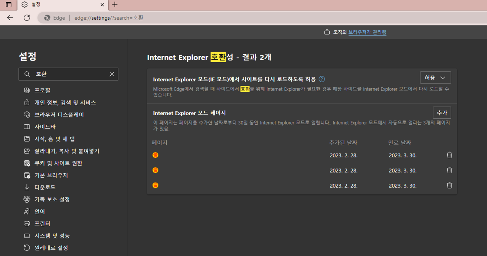 Internet Explorer 모드 페이지 부분에 internet explorer 로 열고 싶은 경로(url) 지정해주면 된다.그냥 모든 것을 internet explorer로 열어야 하는 경우 시도해보자.