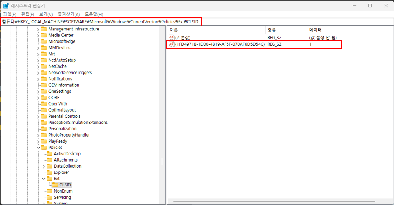 상단에 경로 검색 창이 있다. 여기에 HKEY_LOCAL_MACHINE\SOFTWARE\Microsoft\Windows\CurrentVersion\Policies\Ext\CLSID 를 검색하여 바로 이동해보도록 하자.