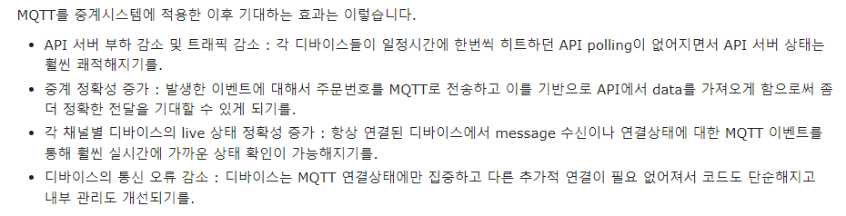 우아한 형제들의 'MQTT 적용을 통하 중계시스템 개선' 글에서 적용 효과 부분을 살펴보면 간결, 정확성, API 서버 부하 및 트래픽 방지 등을 위해 소켓통신 대신 MQTT 를 채택하는 듯 하다.
