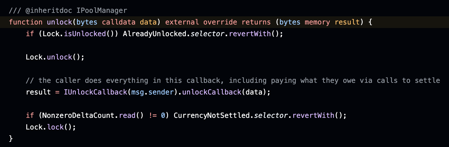Locking은 Transient Storage의 컨셉을 소개하기에 가장 적합한 활용 사례 중 하나이다. Periphery contract는 PoolManager의 unlock() 함수를 호출하는 것으로 컨트랙트 이용 권한을 얻는다. 이후 로직 함수에 onlyWhenUnlocked modifier를 붙여 반드시 정해진 flow대로만 이용이 가능하도록 강제했다.