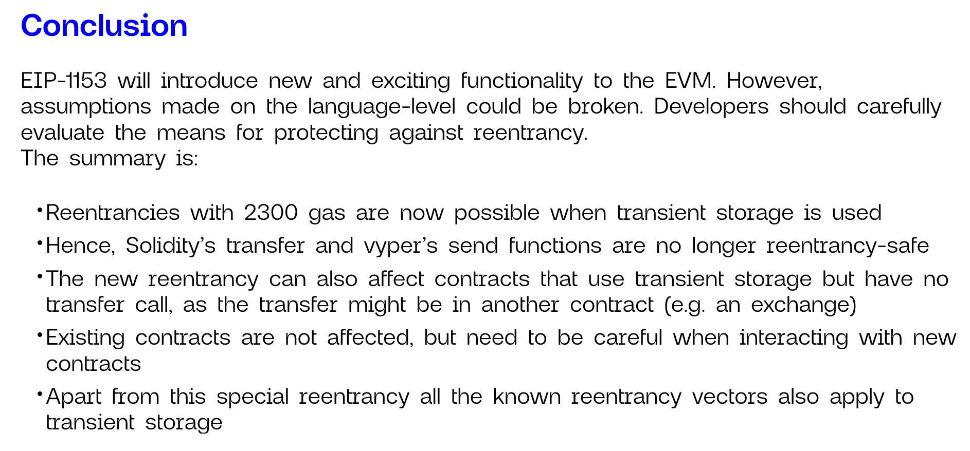 tstore, tload는 EIP-1153를 통해 매 트랜잭션마다 초기화되는 임시 storage 변수를 사용할 수 있도록 제안했다. Cancun hardfork에서 처음 모습을 드러냈으며, solc version 0.8.24부터 해당 opcode의 사용을 지원한다.transfer 또는 Vyper의 send 함수는 고정적으로 낮은 가스비를 사용하여 Native Token을 전송했다. 덕분에 어떤 컨트랙트는 Reentrancy 공격에 취약한 구조였음에도 다행히 공격의 대상이 되지 않았다. 그러나 transient storage를 사용하면 재진입 시에도 상태를 매우 저렴한 가격에 보존할 수 있다.ChainSecurity 팀은 포스트를 통해 Cancun 이전의 컨트랙트와의 상호작용 괜찮지만, 새로운 컨트랙트의 상호작용에 유의해야 한다 고 설명했다. 이러한 기능 추가를 통해 개발 편의성과 연산 효율성이 증가했지만, 이와 동시에 결과적으로 기존 공격 벡터를 보다 활성화시키게 되었다.