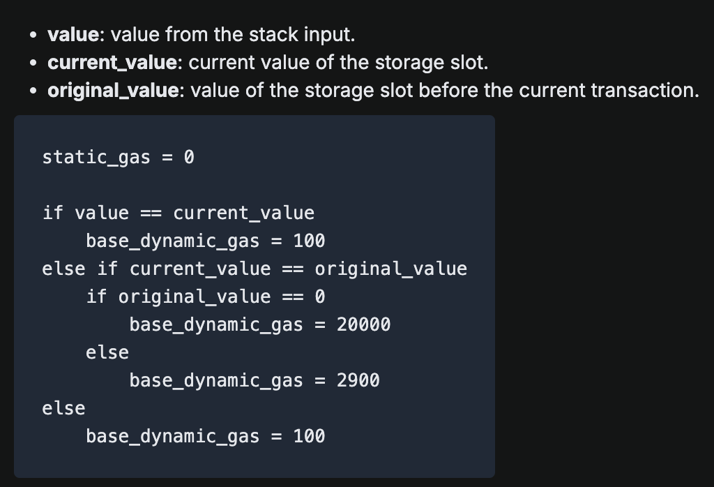 SSTORE의 가스 소비량undefined, null, NIL, None 등 특수한 상태를 정의하여 초기화 이전 상태를 정의한다. 그러나 EVM의 모든 초기 상태는 0이고, 현재 시점에서 트랜잭션 종료 후에도 Contract의 상태를 유지할 수 있는 수단은 오로지 storage 밖에 없다.SSTORE의 가스비는 비싸게 책정되었다. 특히, 처음 슬롯을 할당하는 시점에는 더욱 비싸다. 이유는 슬롯 할당에 대한 제약을 낮출수록 많은 이들이 스토리지를 적극 활용하는 구현을 시작할 것이고, 이는 고스란히 노드의 부담으로 돌아가 결과적으로 체인의 수명을 단축시킬 것이기 때문이다.