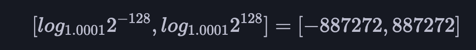 type(uint256).max를 price의 최대값으로 설정했다는 것이다.2**128를 최대값으로 가지게 되고, 밑을 1.0001(basis point)로 취하는 로그에 진수로 넣어 계산하면 다음과 같이 동일한 범위의 구간을 얻을 수 있게 된다.