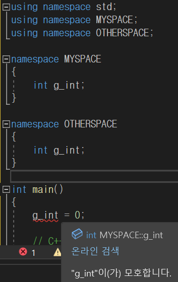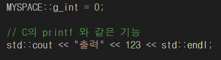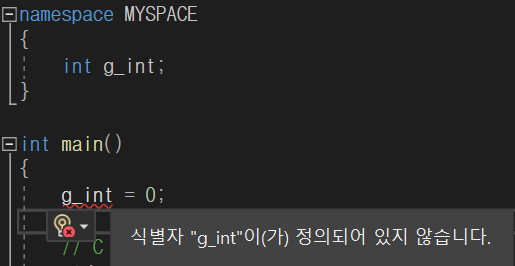 -> main 밖에서 선언되었으니 전역변수는 맞지만, 네임스페이스 안에 만들어진 것이므로 그 바깥에서 사용하려면 범위 지정 연산자(::) 를 사용해야 한다.