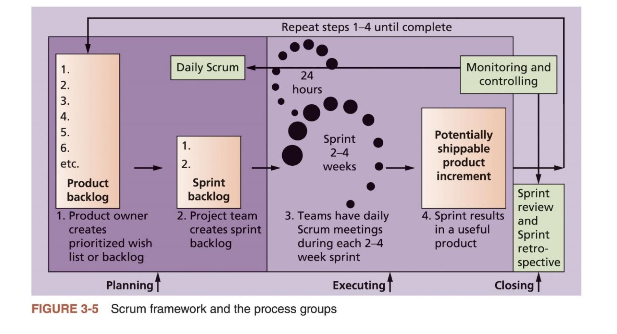 - Initiaing, Planning, Executing, Monitoring/Controlling, Closing