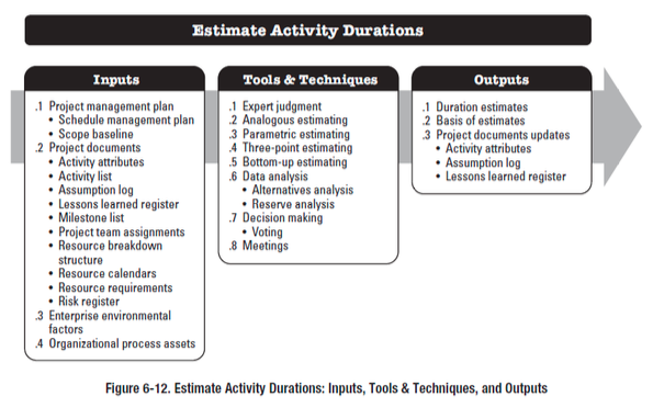 - Three-point estimating : includes an optimistic(최단), most likely(가능성 높음), pessimistic(최악) estimate -> Duration estimate = (Best+4*Likely(+Pessimistic)/6