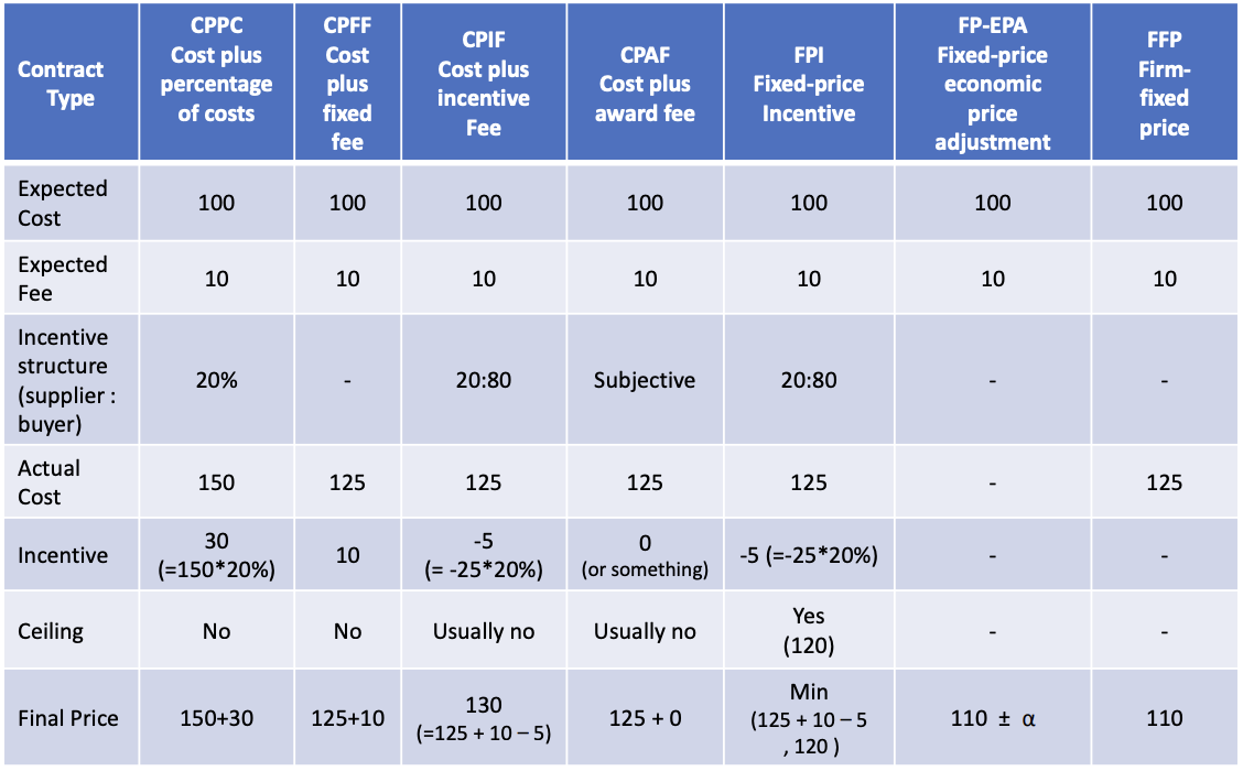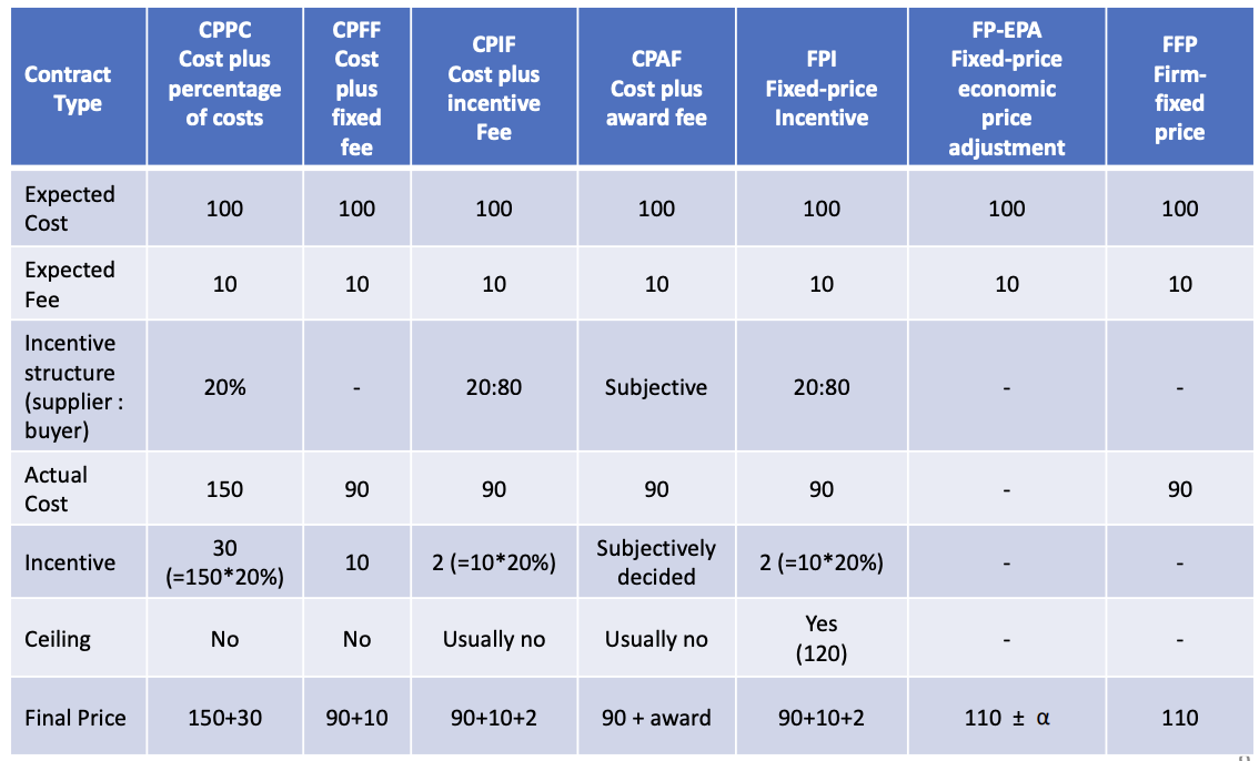 - Cost-reimbursable contracts(비용 상환 계약) : involve payment to the seller for direct and indirect costs (구매자가 실제 비용 + 일정 수수료(이익)를 공급자에게 상환)