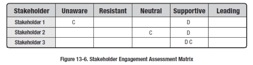 - Stakeholder Management Assessment Matrix : 현재 참여 상태(C)와 목표 상태(D)를 비교하여 모니터링