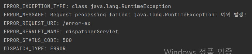 클라이언트가 /error-ex 경로를 요청한 상황, DispatcherType이 REQUEST로 표시되며, 이는 클라이언트의 직접적인 요청임을 의미한다.