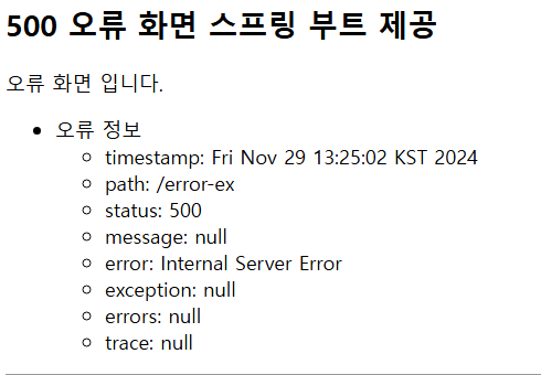 BasicErrorController 컨트롤러는 다양한 정보를 model에 담아서 뷰에 전달한다. 뷰 템플릿은 이 값을 활용해서 출력할 수 있다.