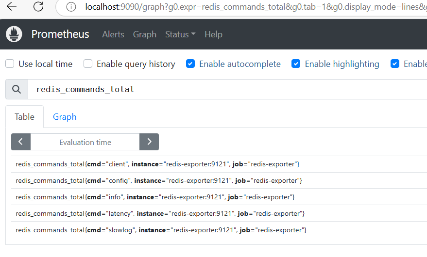 http://localhost:9090 에서 Prometheus에 redis_commands_total 입력 후 실행하면 scrape_interval 에서 설정한 5초 간격으로 최신 메트릭 데이터를 가져온다.