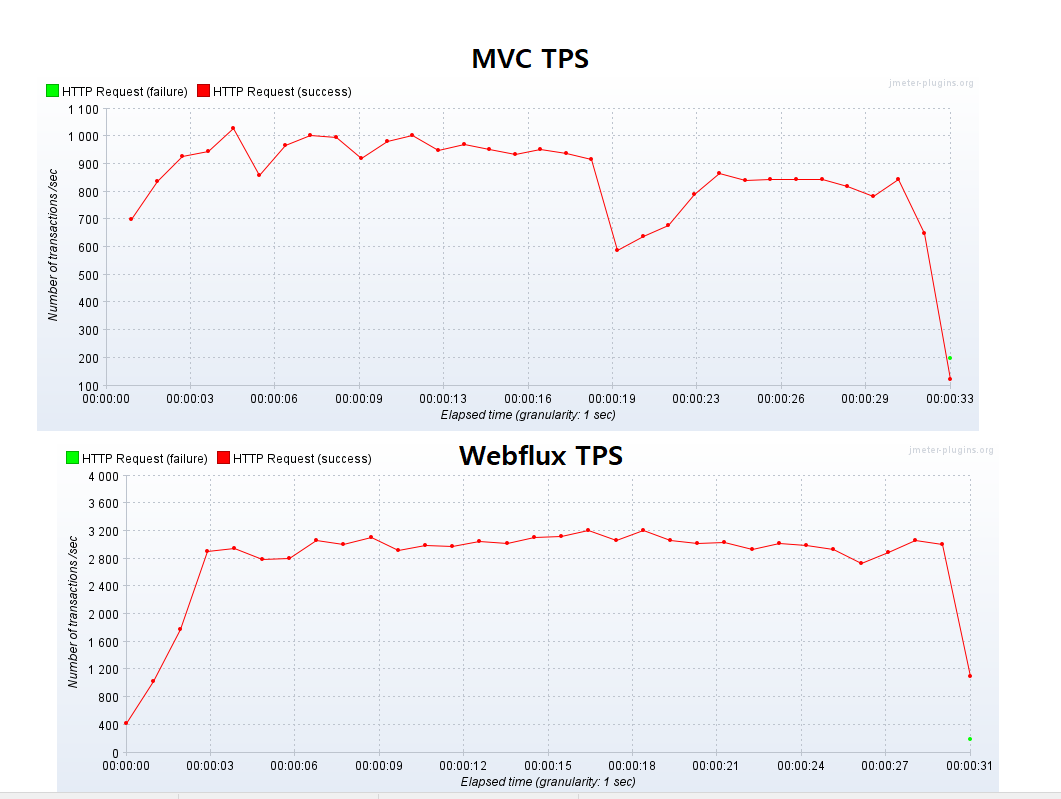 MVC의 TPS는 가장 높은 수치가 1000대 인 방면, Webflux는 평균 3300의 트랜잭션을 처리하며 높은 성능을 보인다.