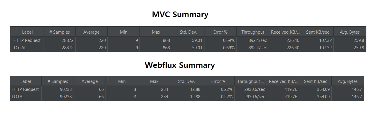 Webflux가 MVC보다 Throughput에서 3배 차이,응답 속도에서 3배 차이를 보이며 대용량 트래픽 환경에서 동기 방식인 MVC 보다 Webflux가 성능이 훨씬 나은것을 확인할수 있다.