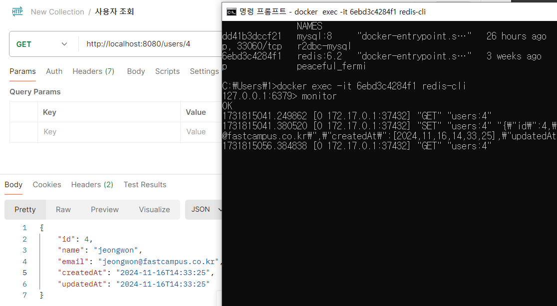 http://localhost:8080/users/4 에 Get요청(findById)을 보낼시 처음에 Redis 질의 후 SET을 진행하고 이후 요청시 Redis GET만 진행된다.(캐시)
