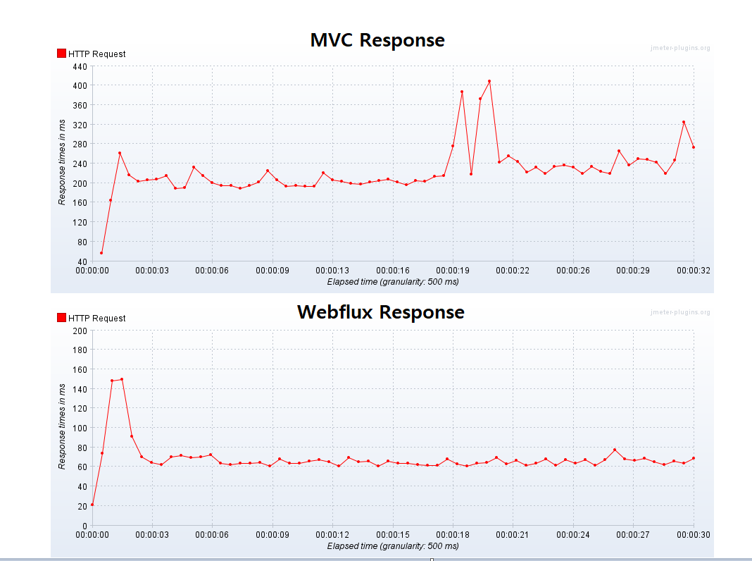 응답 시간에서 Webflux는 안정적이고 빠른 응답 속도(60초)를 보이는 반면, MVC는 편차가 있고 느린 응답 속도(250초)를 보인다.