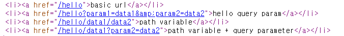 <li><a th:href="@{/hello/{param1}(param1=${param1}, param2=${param2})}">path variable + query parameter</a></li>