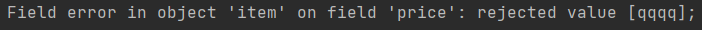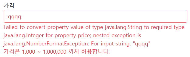 다음과 같이 가격을 제출하면 Integer 필드에 바인딩 되기 때문에 문자 입력시 오류가 발생한다. Spring은 Typemismatch라는 오류 코드를 사용한다. 문제는 default 메세지가 지저분하고 길어 고객에게 보여주기 어렵다. 해결 방법은 errors.properties에 Typemismatch 오류 코드를 직접 추가한다.