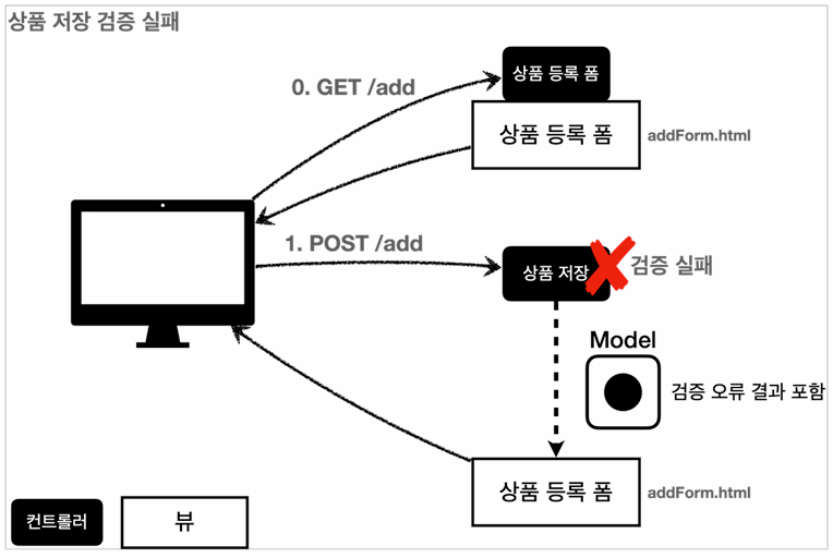 사용자가 GET으로 상품 등록 폼을 가져오고, 작성 후 POST로 요청을 보낼때 기존 Redirect/Get 방식이 아닌 컨트롤러에서 검증 과정을 거쳐 오류가 발생하면 모델에 데이터를 담고 기존 폼으로 돌려보내면 고객의 불편이 최소화된다.