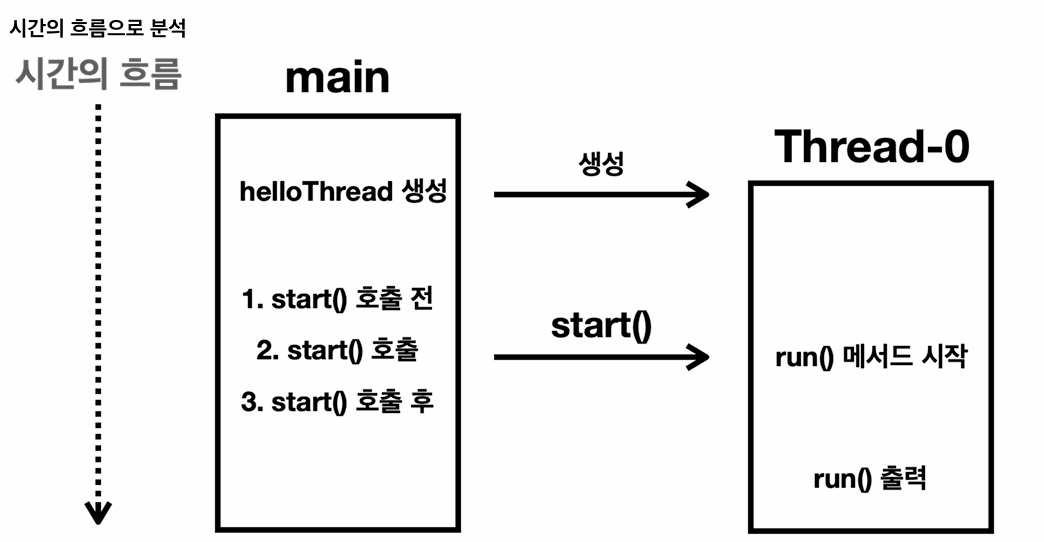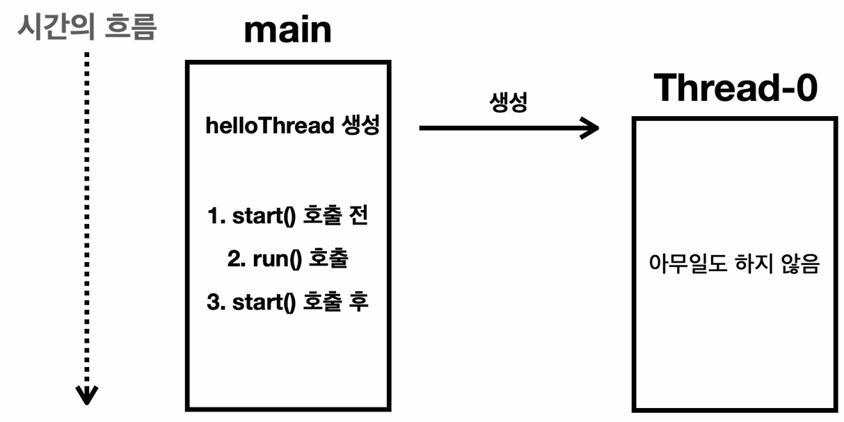 start() 메서드를 호출합니다.start() 메서드는 스레드를 실행하는 아주 특별한 메서드입니다.start() 를 호출하면 HelloThread 스레드가 run() 메서드를 실행합니다.주의! run() 메서드가 아니라 반드시 start() 메서드를 호출해야 합니다. 그래야 별도의 스레드에서 run() 코드가 실행됩니다.