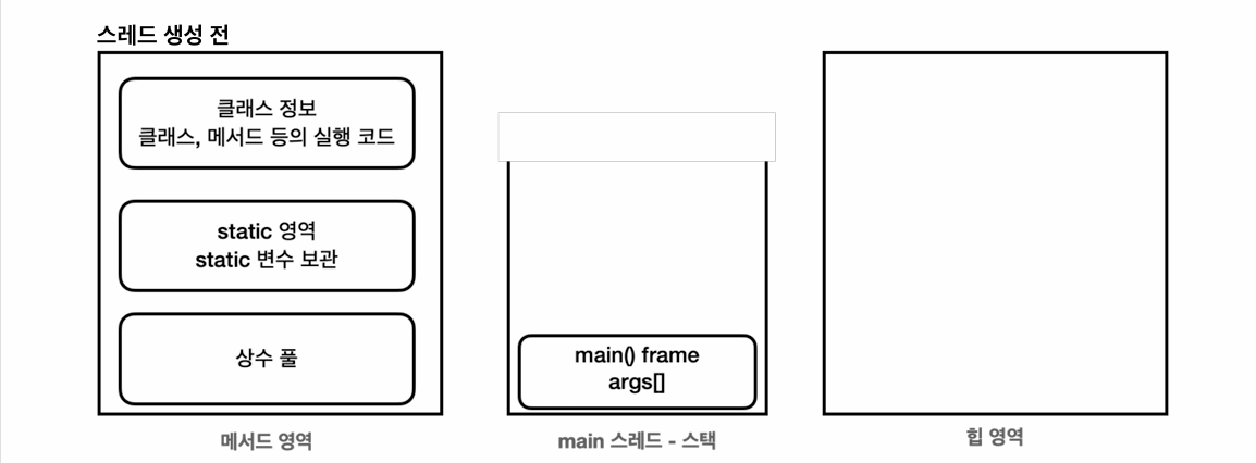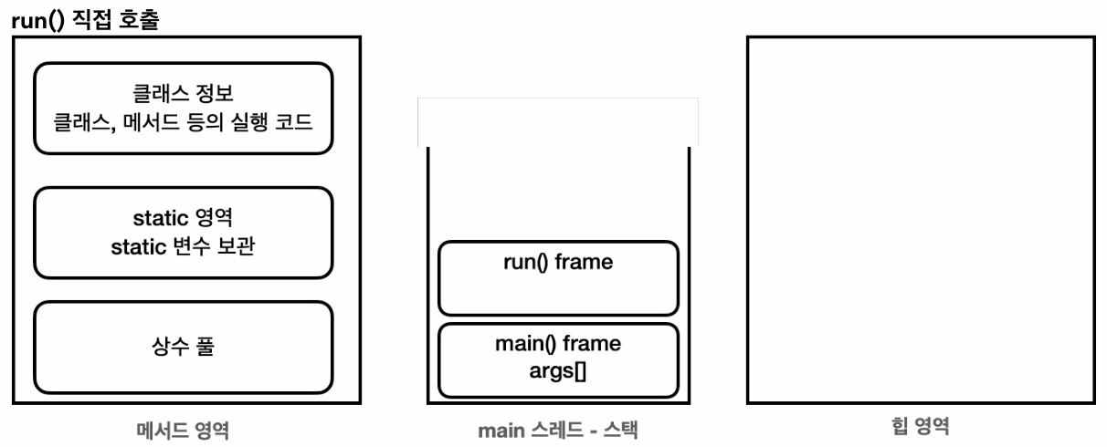참고: 스택 영역은 더 정확히는 각 스레드별로 하나의 실행 스택이 생성됩니다. 따라서 스레드 수 만큼 스택이 생성 됩니다. 지금은 스레드를 1개만 사용하므로 스택도 하나입니다. 이후 스레드를 추가할 것인데, 그러면 스택도 스레드 수 만큼 증가합니다.