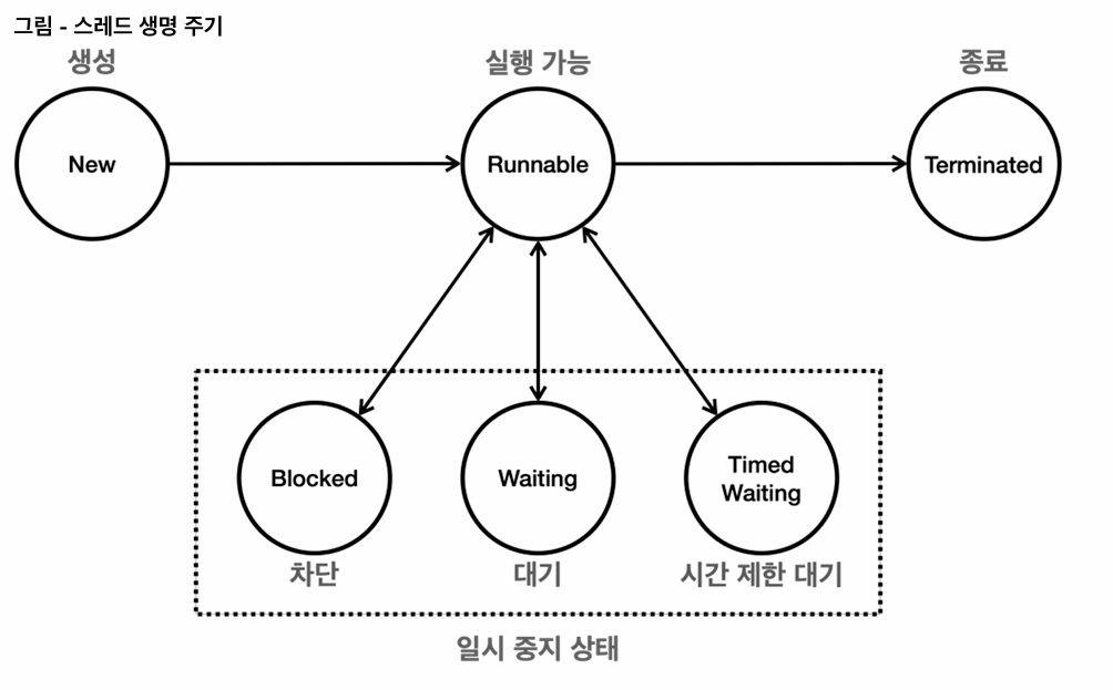 💡 일시 중지 상태(BLOCKED, WAITING, TIMED_WAITING)를 통틀어 Suspended States라고 부르기도 하나, 이는 자바 공식 용어는 아니고 설명용이다.