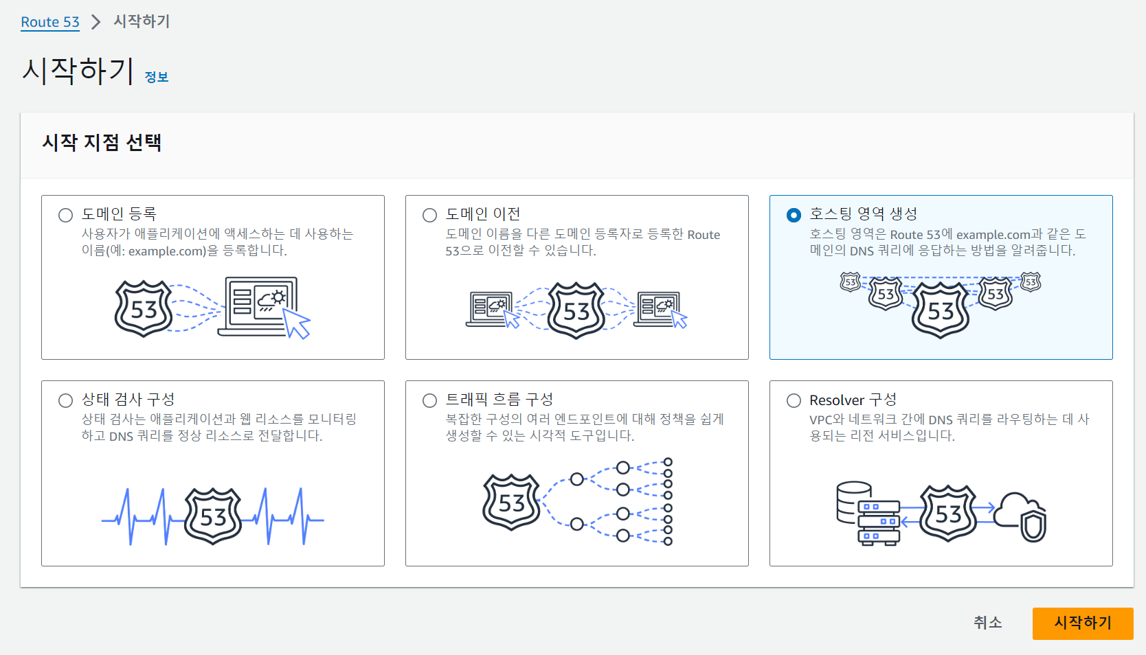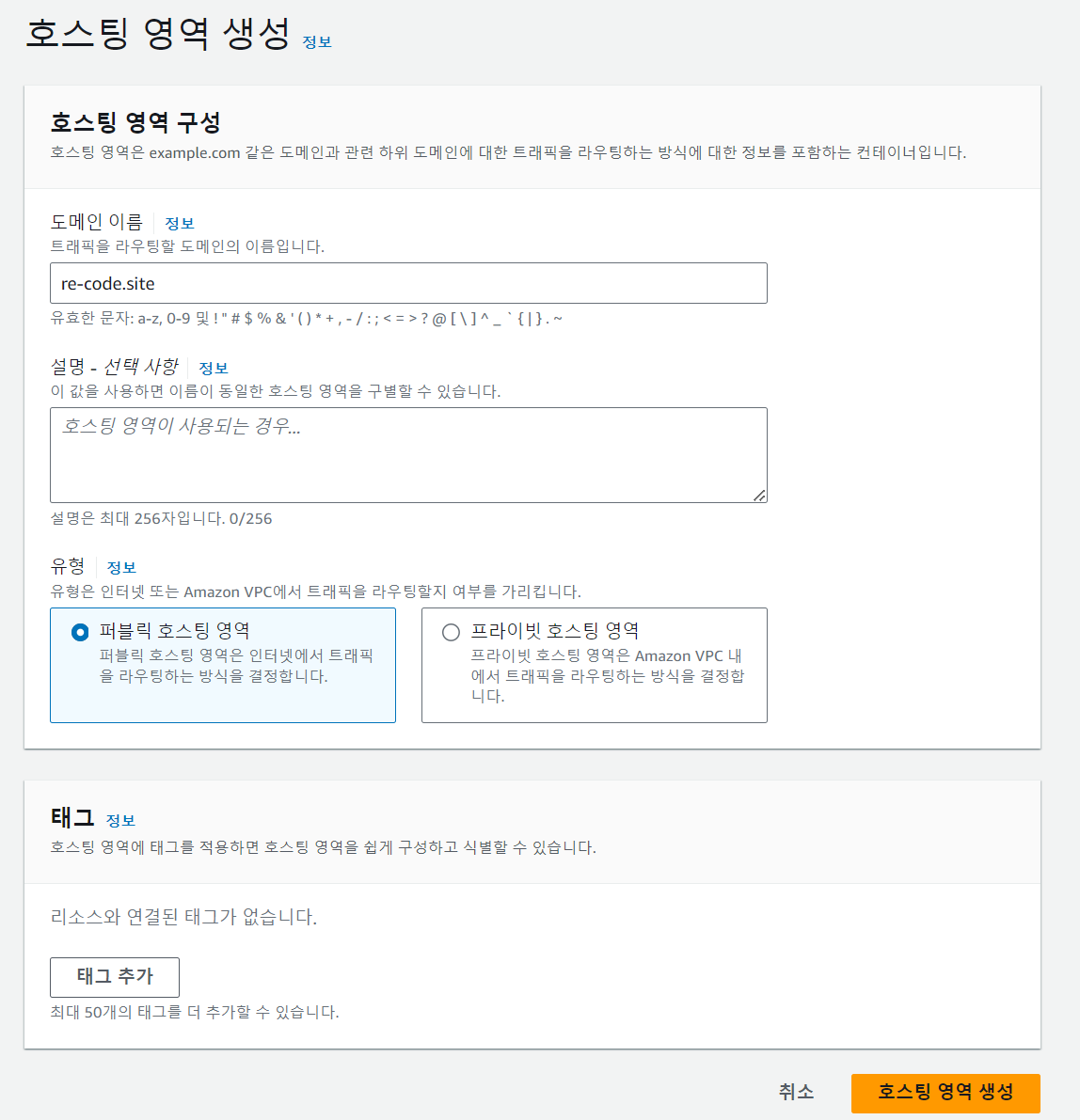 AWS의 Route 53으로 가서 호스팅 영역 생성을 눌러준다.