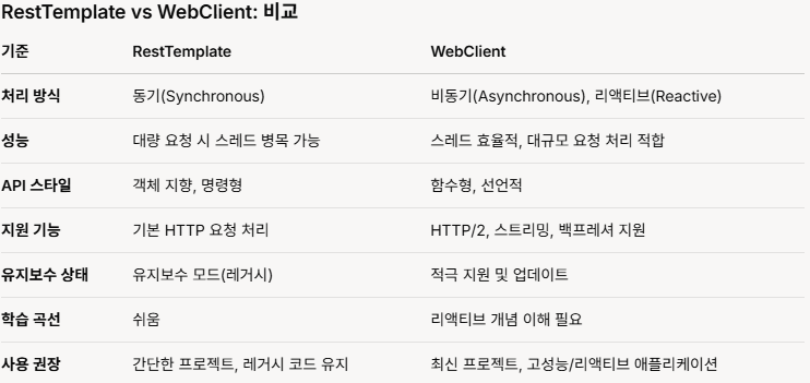 RestTemplate은 간단하고 배우기 쉬운 도구지만, 대규모 트래픽이나 스트리밍, 비동기 등을 처리하기엔 한계가 있다. 반면, WebClient는 비동기와 리액티브 프로그래밍을 지원하며 현대적인 웹 애플리케이션에 최적화돼 있다. Spring Boot 3.4.3 같은 최신 환경에서 신규 프로젝트를 시작한다면 WebClient를 선택하는 게 미래 지향적이다.
