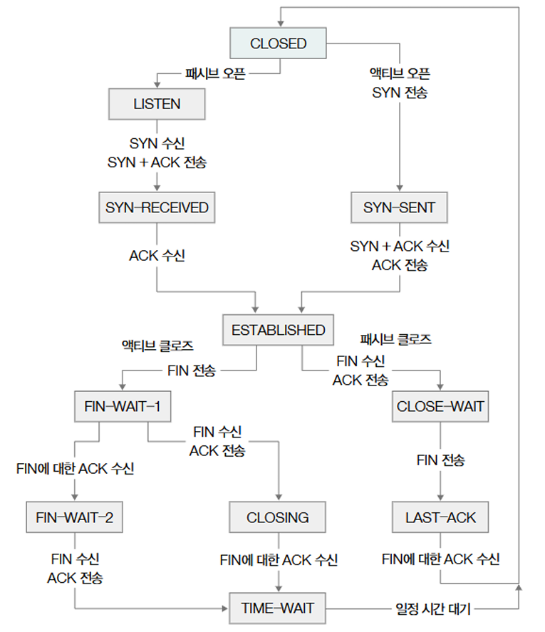 📌 연결 종료 시 송신 측은 ‘액티브 클로즈’, 수신 측은 ‘패시브 클로즈’ 상태가 된다.