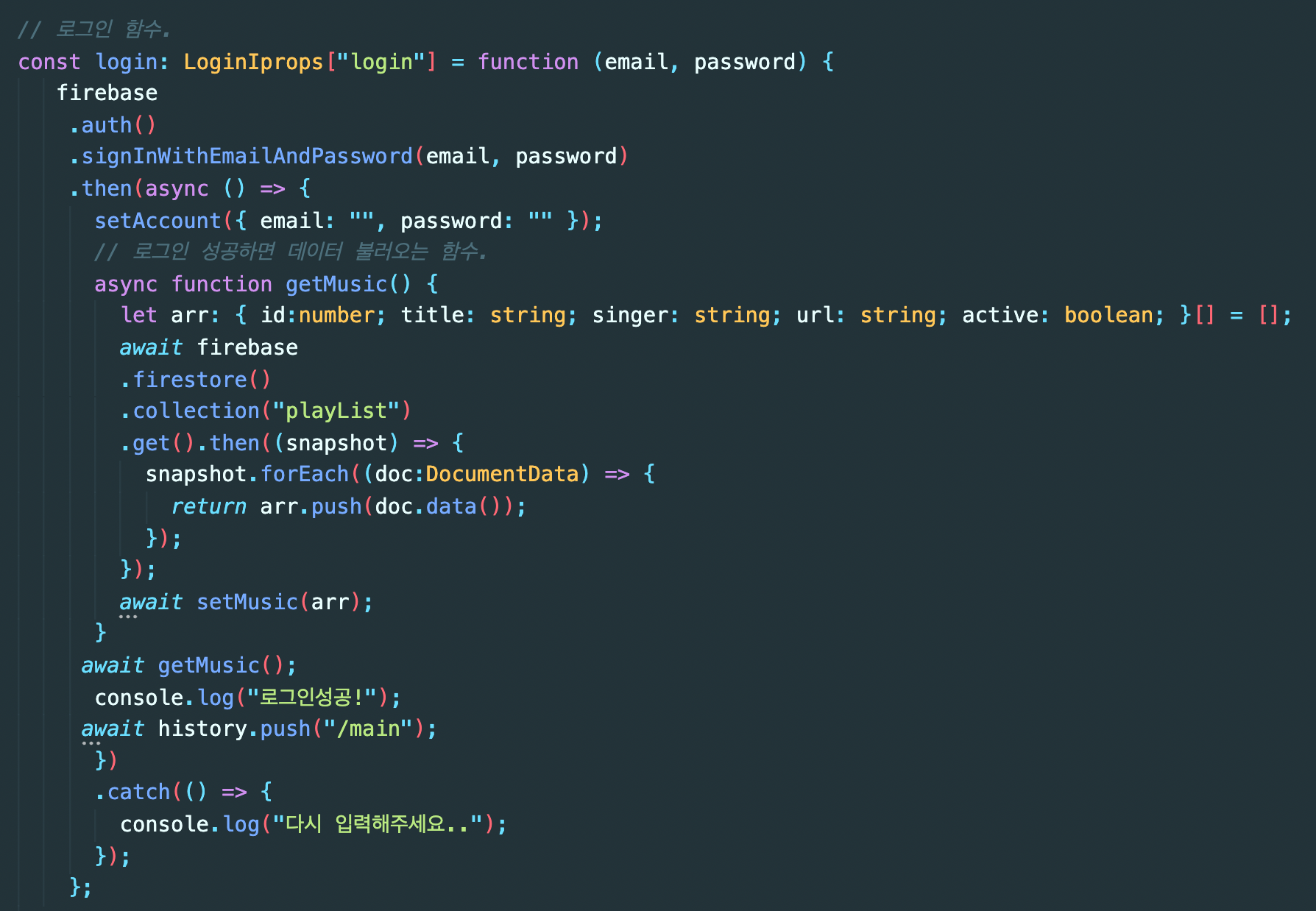 그래서 async/await을 사용하면 코드가 차곡차곡 정직하게 실행되서 로그인 인증을 하고 데이터를 받아오는 아주 착한 함수가 만들어집니다.