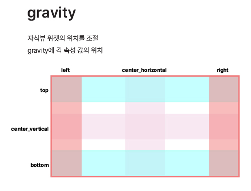 Frame Layout 에서 자식 뷰 위젯의 위치를 조절하기 위해서 gravity 속성을 사용한다.